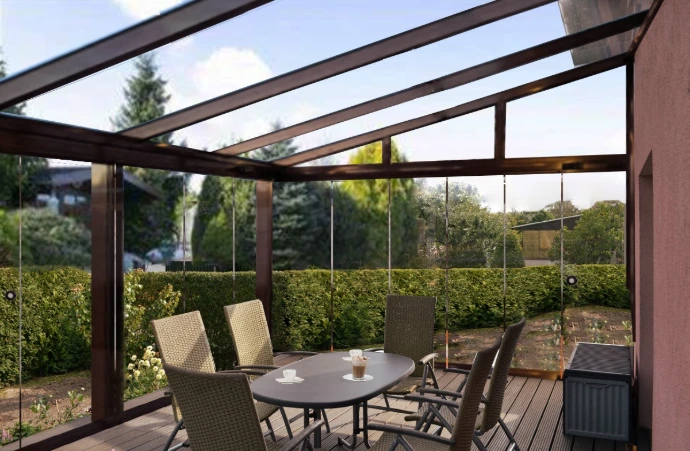 Acoperișul din sticlă oferă un scut eficient împotriva ploii, zăpezii și radiațiilor UV, menținând terasa și mobilierul într-o stare excelentă pe tot parcursul anului.