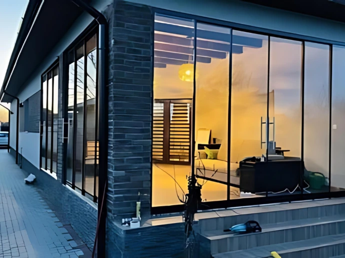 - Panouri fixe din sticlă, fără profile verticale vizibile;